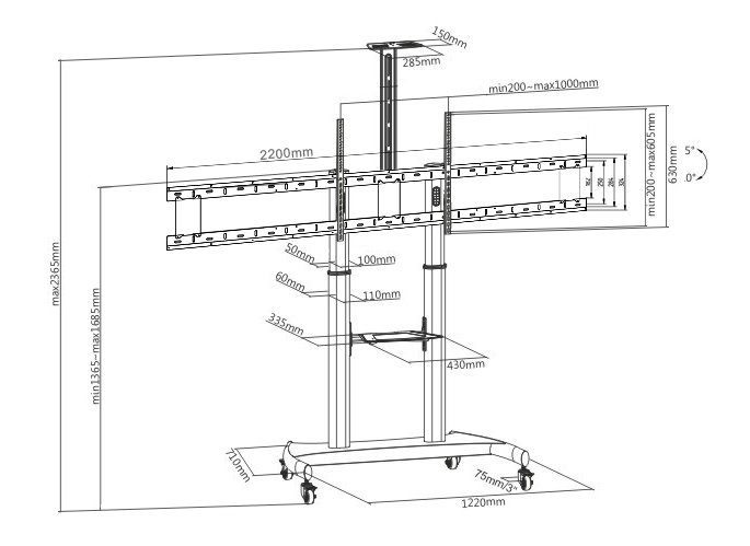 ![]() | Gurulós padlóállvány - képernyőméret: 60-100” képátló- max. furattávolság: VESA1000x600 - min. furattávolság: VESA400x400 - rögzítési magasság állítható: 136-től 168cm-ig (képernyőközép) - dönthetőség: +5°~-10° - max. teherbírás: 100kg - polc teherbírás: 5 kg - méretek: 122x71x204~236cm További képek: - méretezett rajz | |
