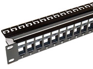 ![]() | Üres UTP patch panel, 24 portos - levehető tehermentesítővel- 24 db UTP sorolható Keystone betéthez - földelés nélküli - 19” széles, 1 unit magas | |